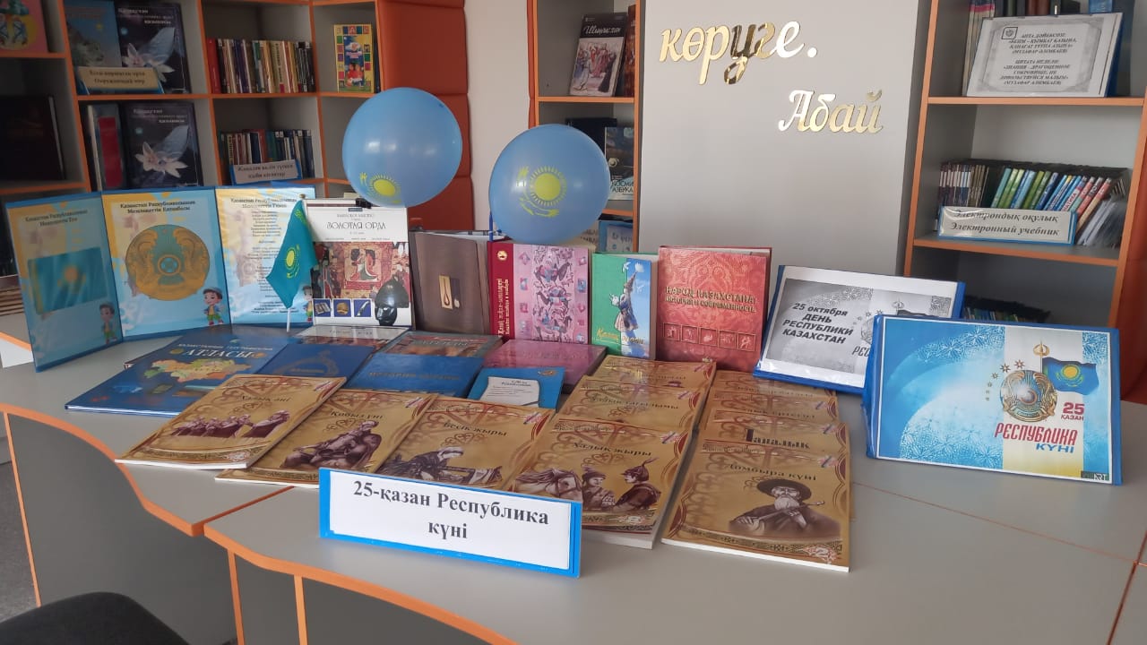 "Балалар кітапханасы" республикалық жобасы аясында оқушыларды елін, жерін, тілін, тарихын құрметтеуге және де сүйіспеншілігін ояту мақсатында 25 қазан - Республика күніне орай "Тұғыры биік Қазақстан" атты кітап көрмесі ұйымдастырылды.Көрменің мақсаты: Тәуелсіз Қазақстанымыздың жетістіктері мен экономикалық дамуы, рухани өміріндегі оң өзгерістерді насихаттау.
