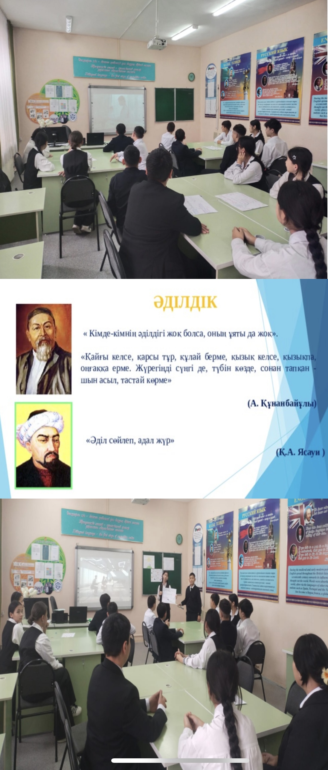 9"Б" сыныбында "Әділдік пен жауапкершілік басты ұстаным" тақырыбында сынып сағаты өтті.