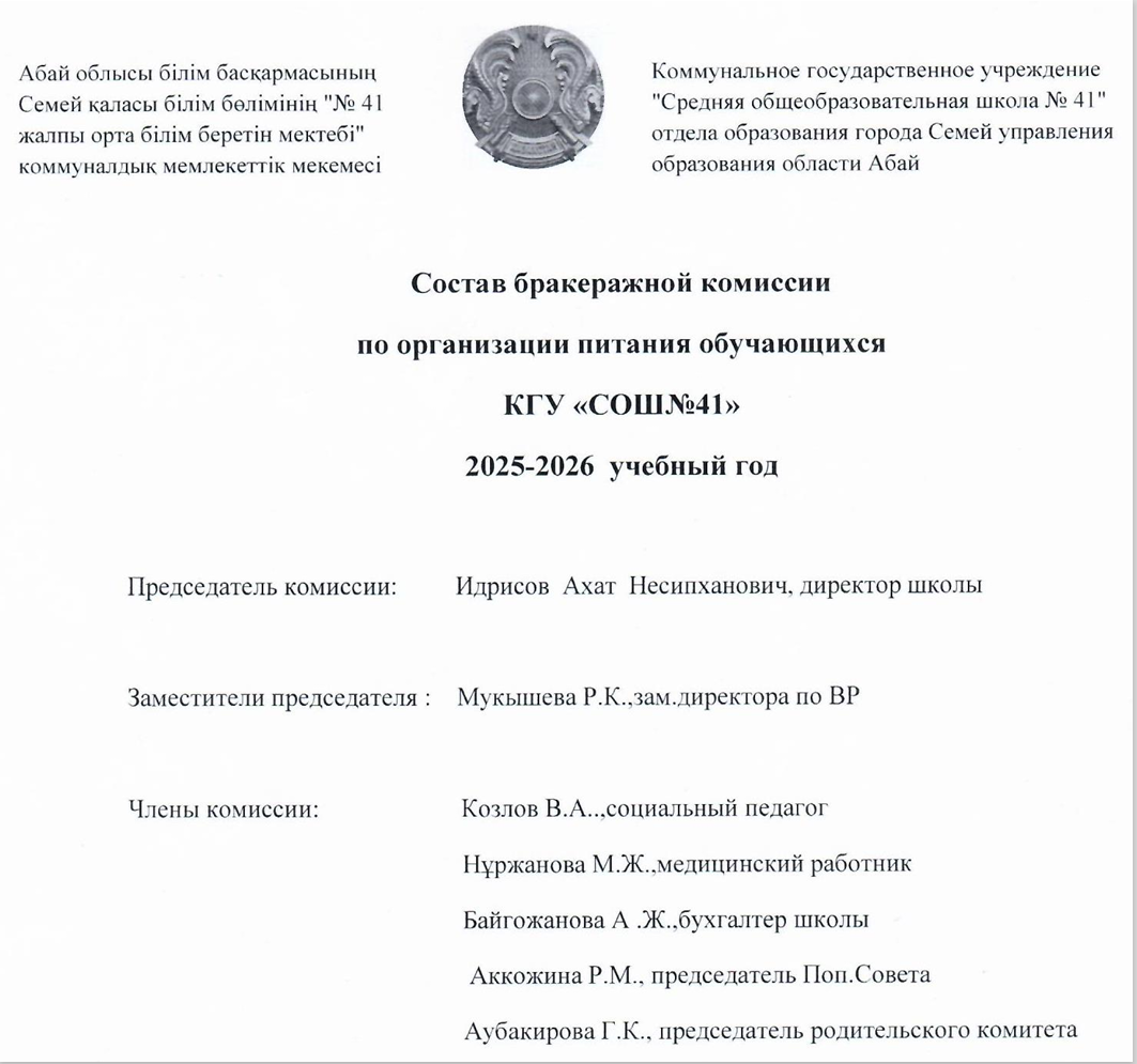 Состав бракеражной комиссии по организации питания обучающихся СОШ №41